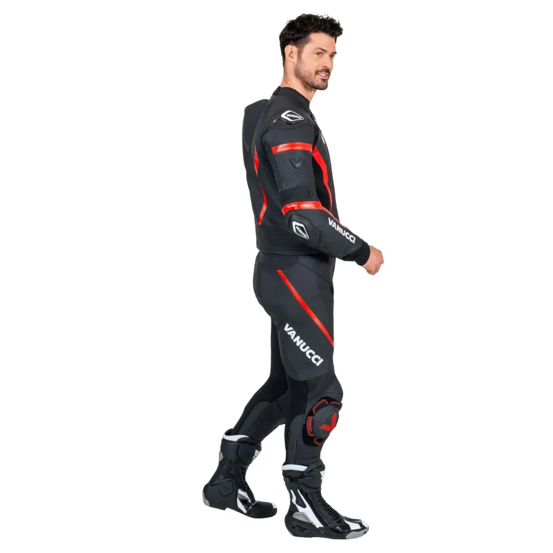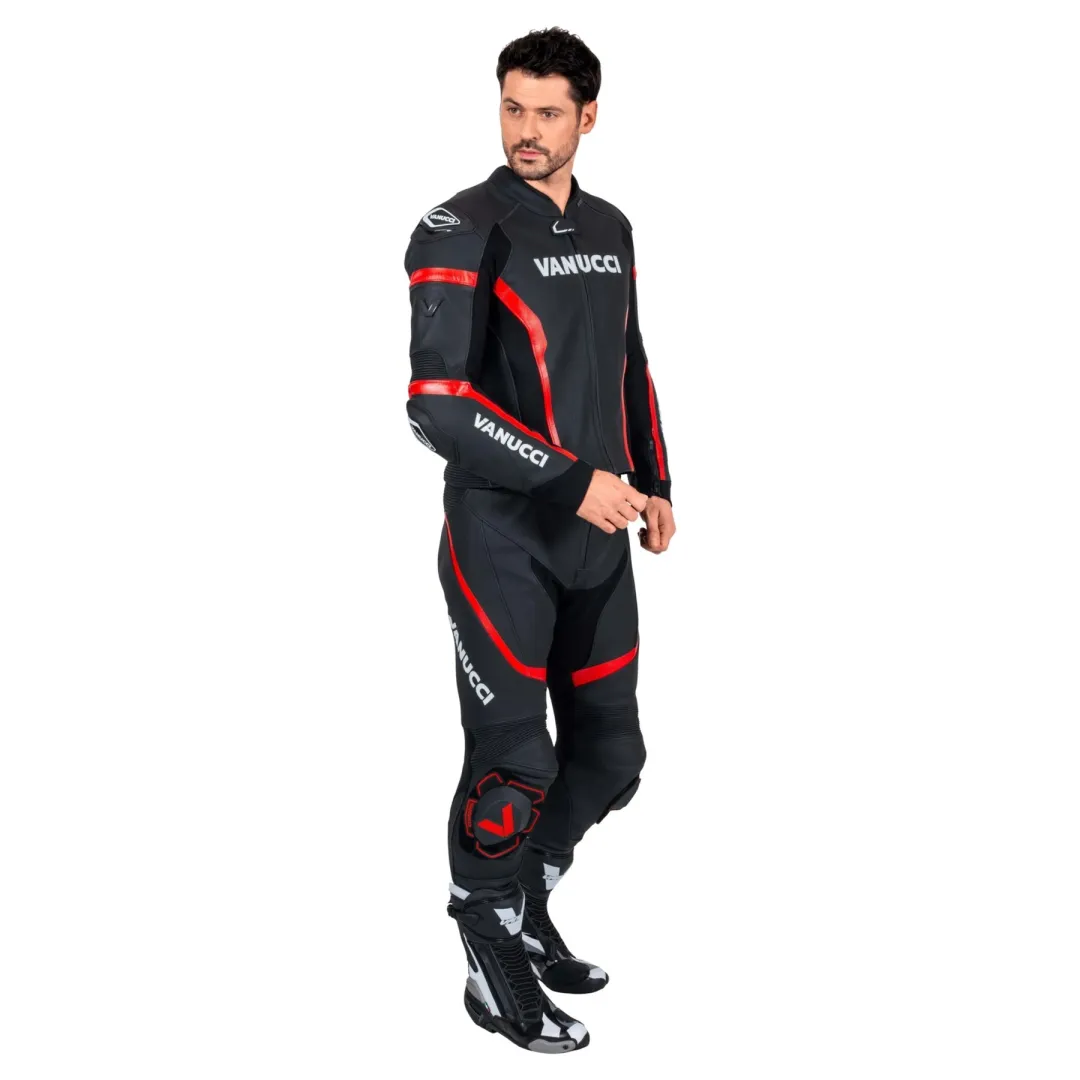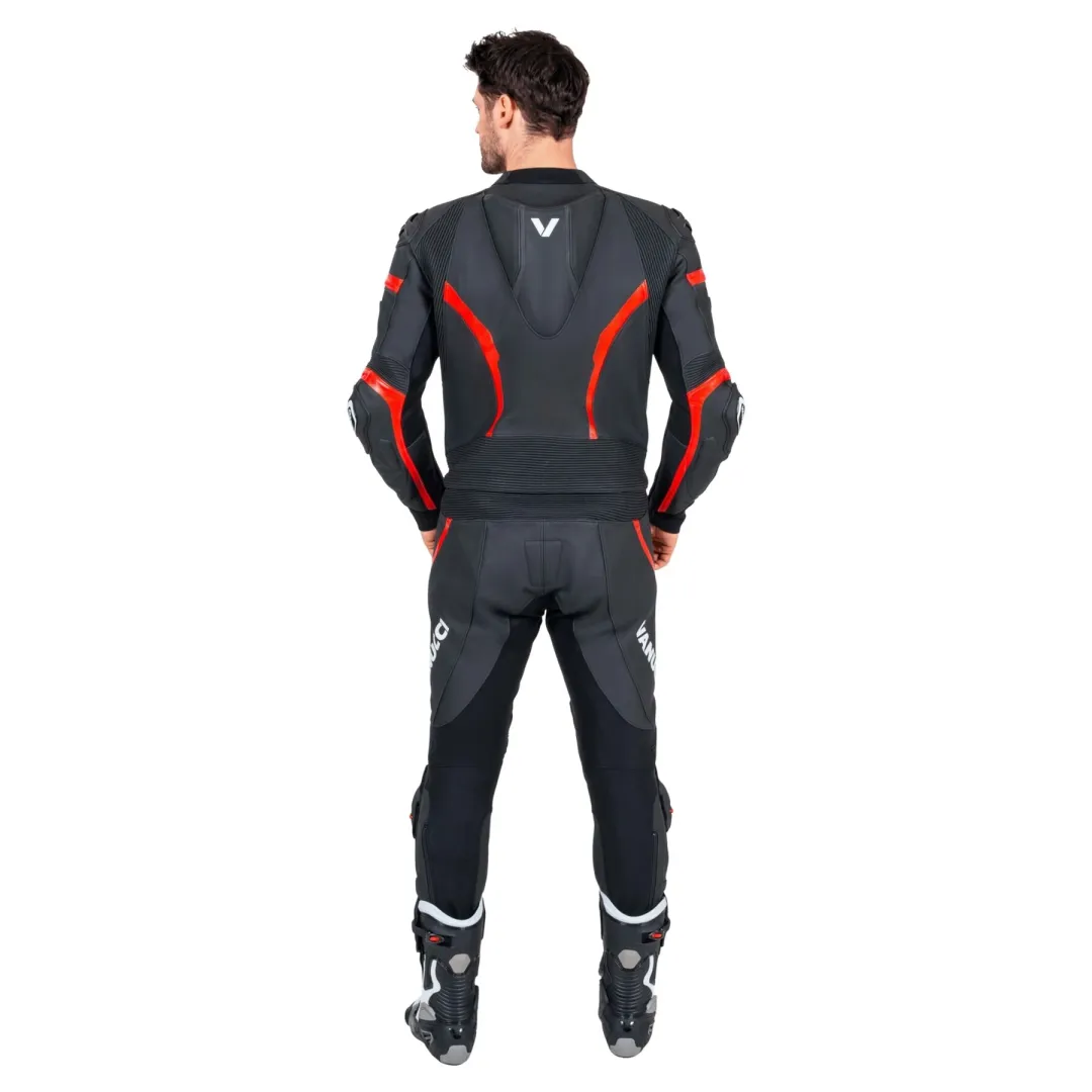 Ось приголомшливий шкіряний костюм: двосекційний Vanucci *VSM-5*. Цей костюм має все, що ви можете побажати від ідеально сидячого, зручного, спортивного та змагального мотоциклетного костюма. Його найяскравішими рисами, безсумнівно, є особливий дизайн, аеродинамічний горб на спині та слайдери на колінах. Високоякісна коров'яча шкіра товщиною 1,2-1,4 мм також дуже приємна на дотик. Велика кількість еластичного матеріалу та перфорація спереду та ззаду забезпечують повний комфорт. У Vanucci *VSM-5* ви будете захоплені, зосереджені та зачаровані кожним поворотом вашого улюбленого маршруту!