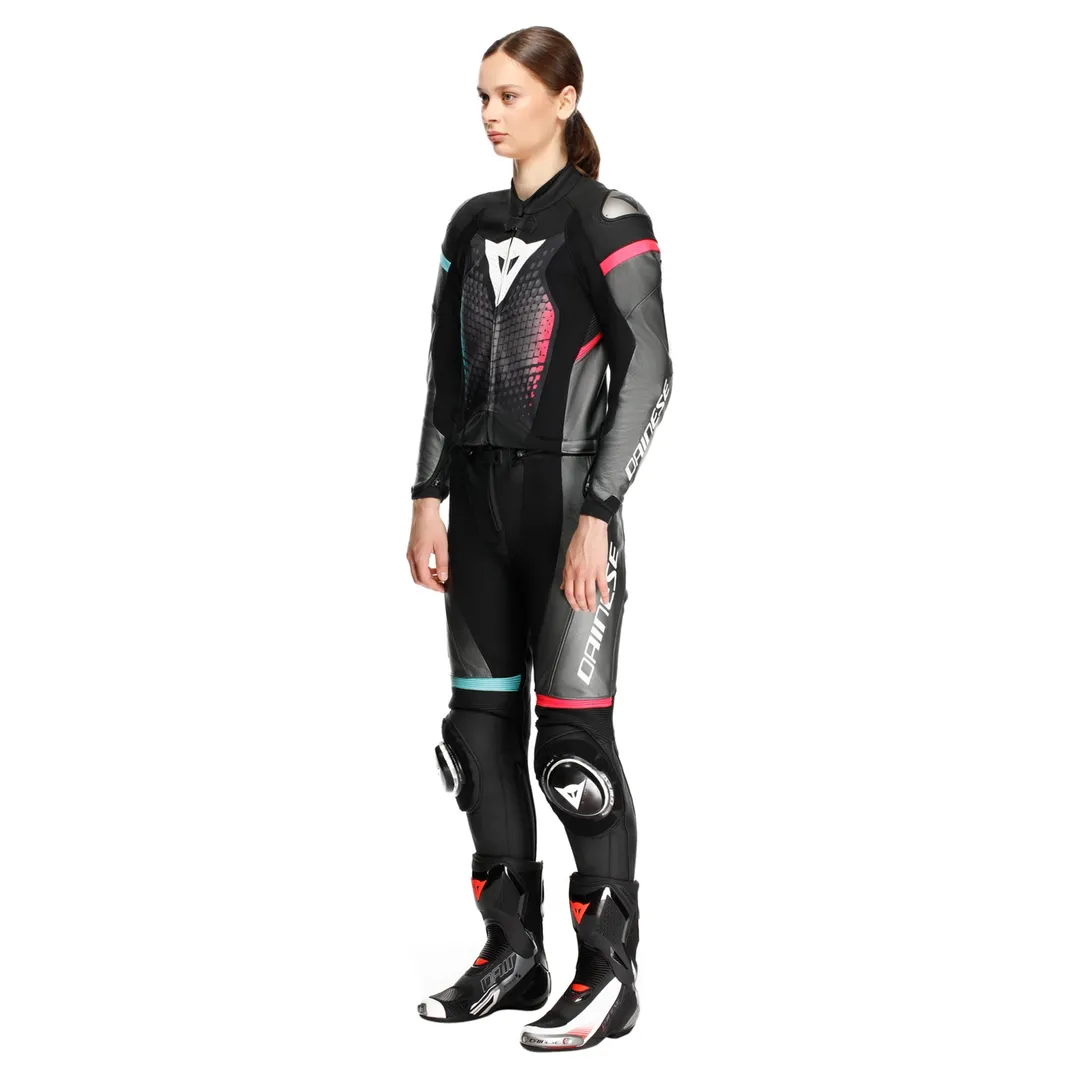 Ви тільки цього й чекали: двосекційний мотоциклетний костюм Dainese *Fulminea* – це саме те, що ви хочете з точки зору зовнішнього вигляду та стандартів. Крім того, шкіряний костюм повністю відповідає вашим очікуванням щодо безпеки та комфорту. Dainese розробив *Fulminea* спеціально для жінок, і завдяки поєднанню високоякісної коров'ячої шкіри Tutu та широких вставок з біеластичної тканини S1, він ідеально адаптується до вашої жіночої фігури. Міцний матеріал також пропонує велику еластичність та інтегровану повітропроникність, щоб ви могли насолоджуватися оптимальним комфортом. Dainese *Fulminea* перевищує клас захисту AAA та оснащений протекторами рівня 1 на плечах, ліктях та колінах, а також м'якими протекторами Pro-Shape 2.0 на стегнах. М'який аеродинамічний горб та нові наколінники RSS 4.0 забезпечують спортивний вигляд. А якщо наколінники «розгойдуються» після багатьох кіл на вашій улюбленій трасі, ви можете легко та просто замінити їх, оскільки положення основи залишається незмінним і кріпиться за допомогою липучки. Костюм Dainese *Fulminea* також добре підійде для їзди під дощем. Практична водонепроникна внутрішня кишеня, наприклад, захищає ваш смартфон від вологи.