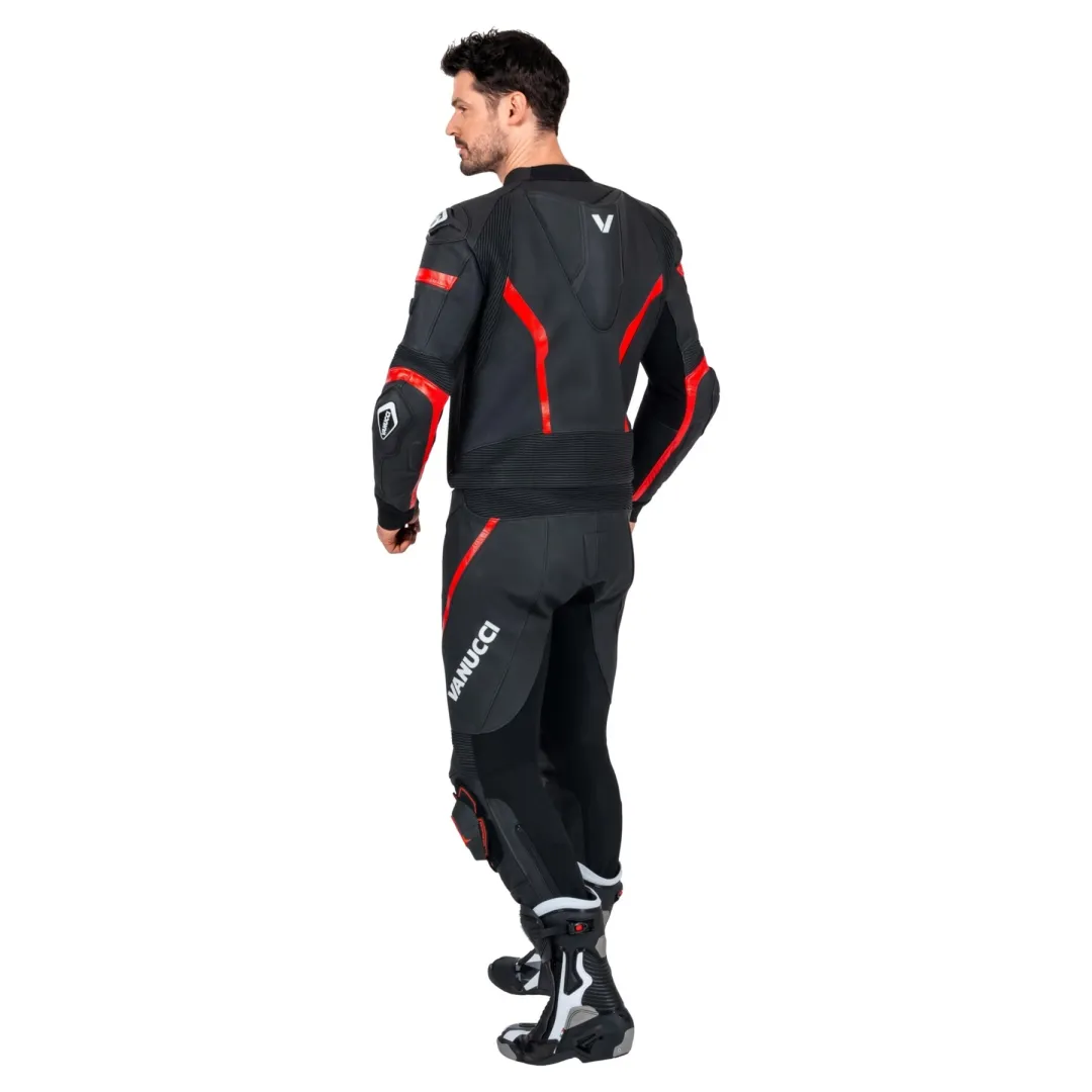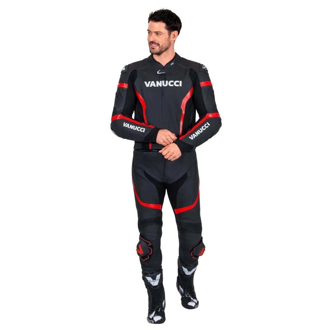 Ось приголомшливий шкіряний костюм: двосекційний Vanucci *VSM-5*. Цей костюм має все, що ви можете побажати від ідеально сидячого, зручного, спортивного та змагального мотоциклетного костюма. Його найяскравішими рисами, безсумнівно, є особливий дизайн, аеродинамічний горб на спині та слайдери на колінах. Високоякісна коров'яча шкіра товщиною 1,2-1,4 мм також дуже приємна на дотик. Велика кількість еластичного матеріалу та перфорація спереду та ззаду забезпечують повний комфорт. У Vanucci *VSM-5* ви будете захоплені, зосереджені та зачаровані кожним поворотом вашого улюбленого маршруту!